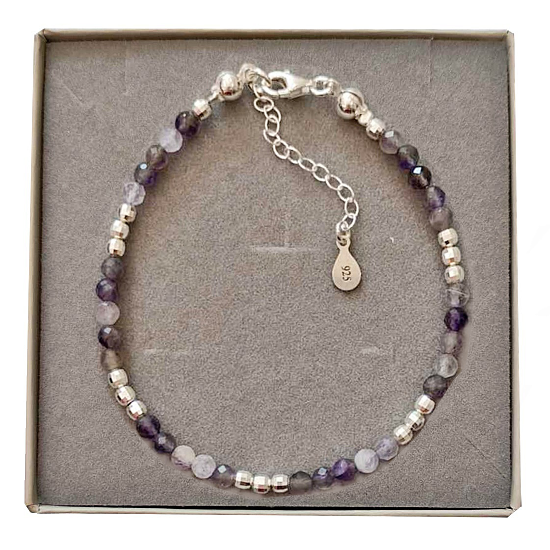 Oferujemy Państwu bransoletkę wykonaną z naturalnego kamienia - ametyst, oraz srebrnych błyszczących kuleczek. Regulacja oraz zakończenie bransoletki również wykonana ze srebra próby 925.