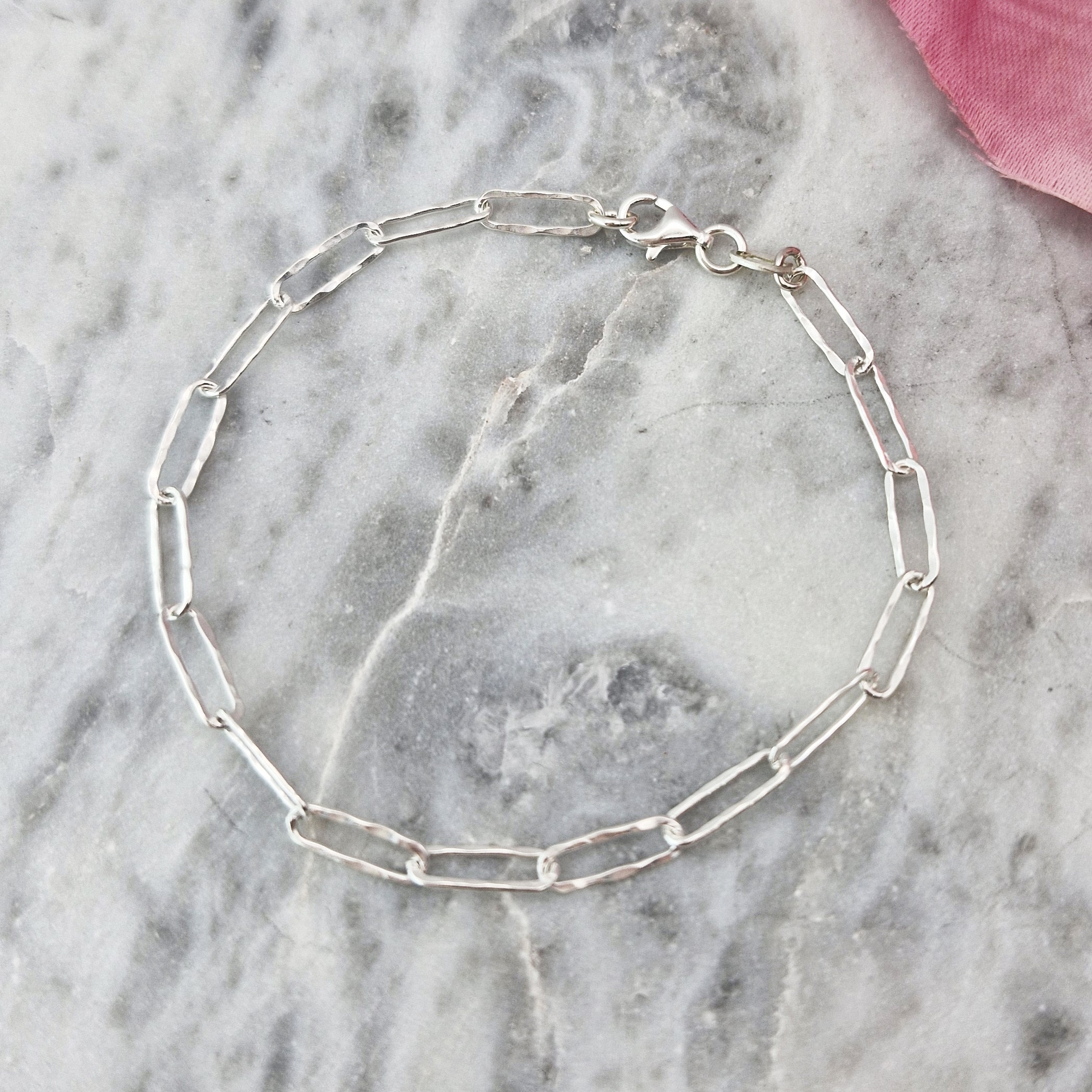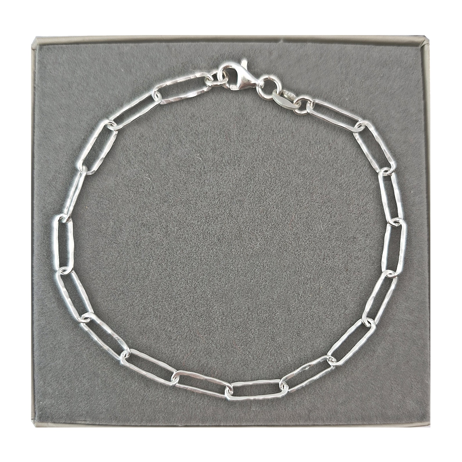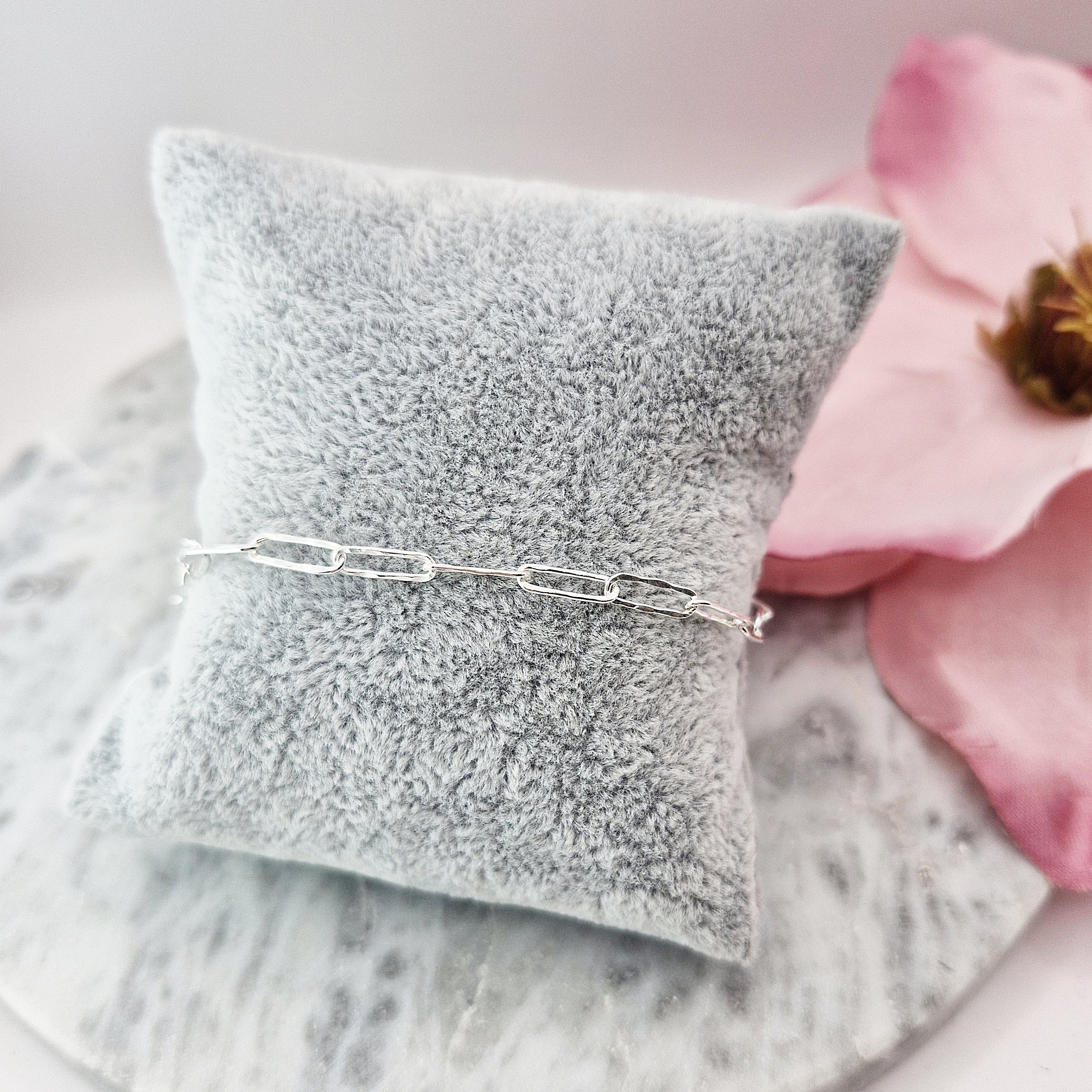 Oferujemy Państwu modną w tym sezonie bransoletkę o splocie typu spinacz/łańcuch z nierówną, gniecioną powierzchnią. Bransoletka w całości wykonany ze srebra próby 925.