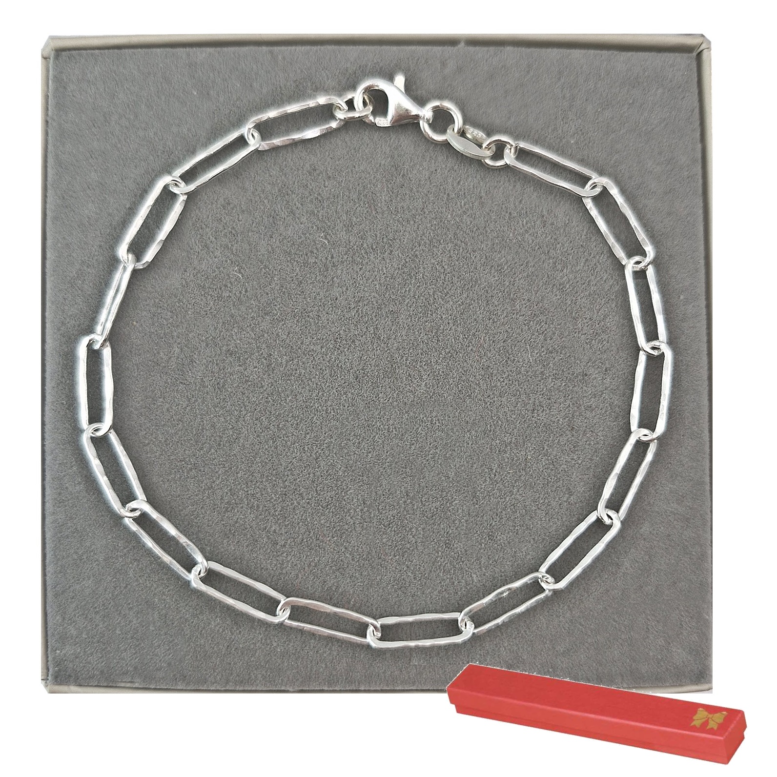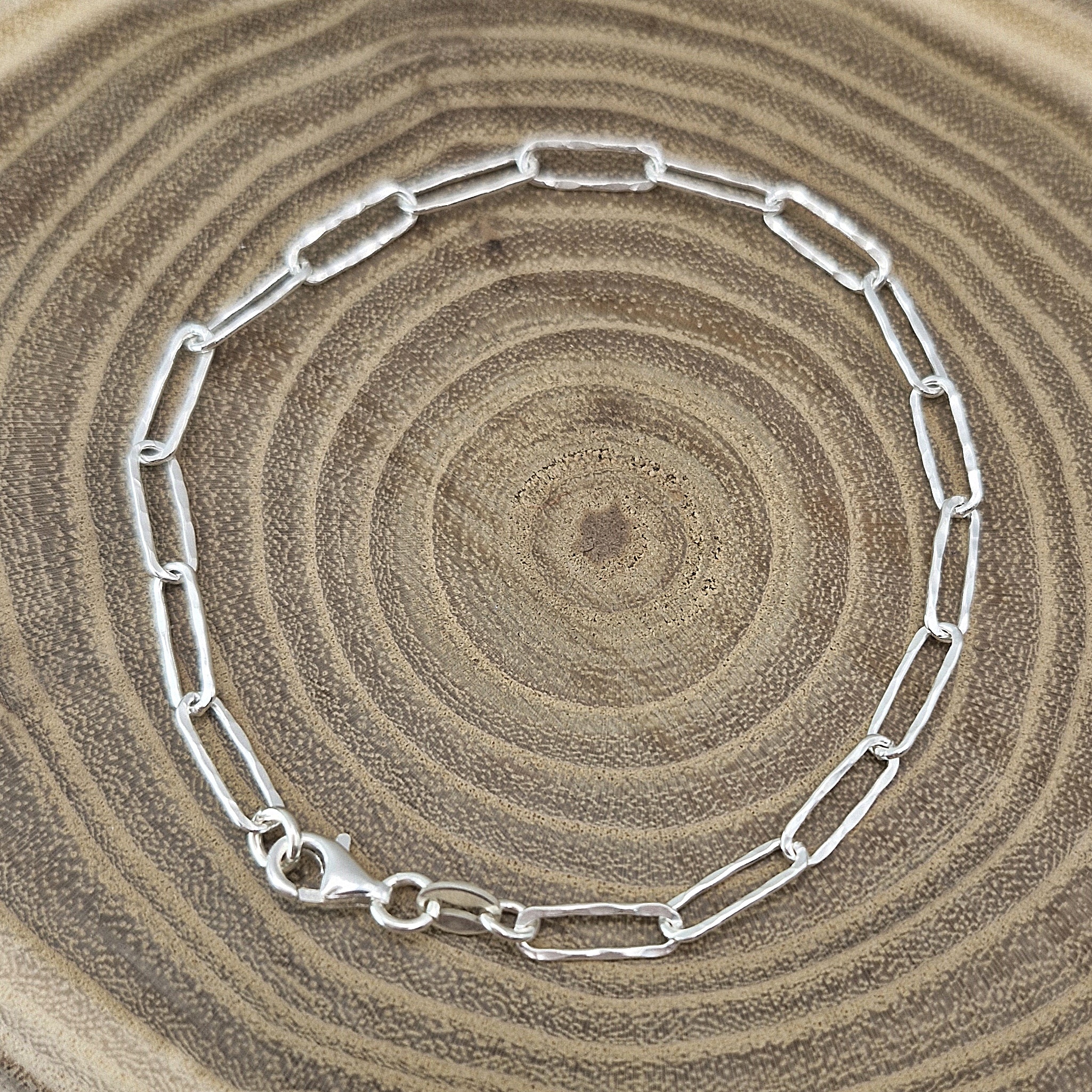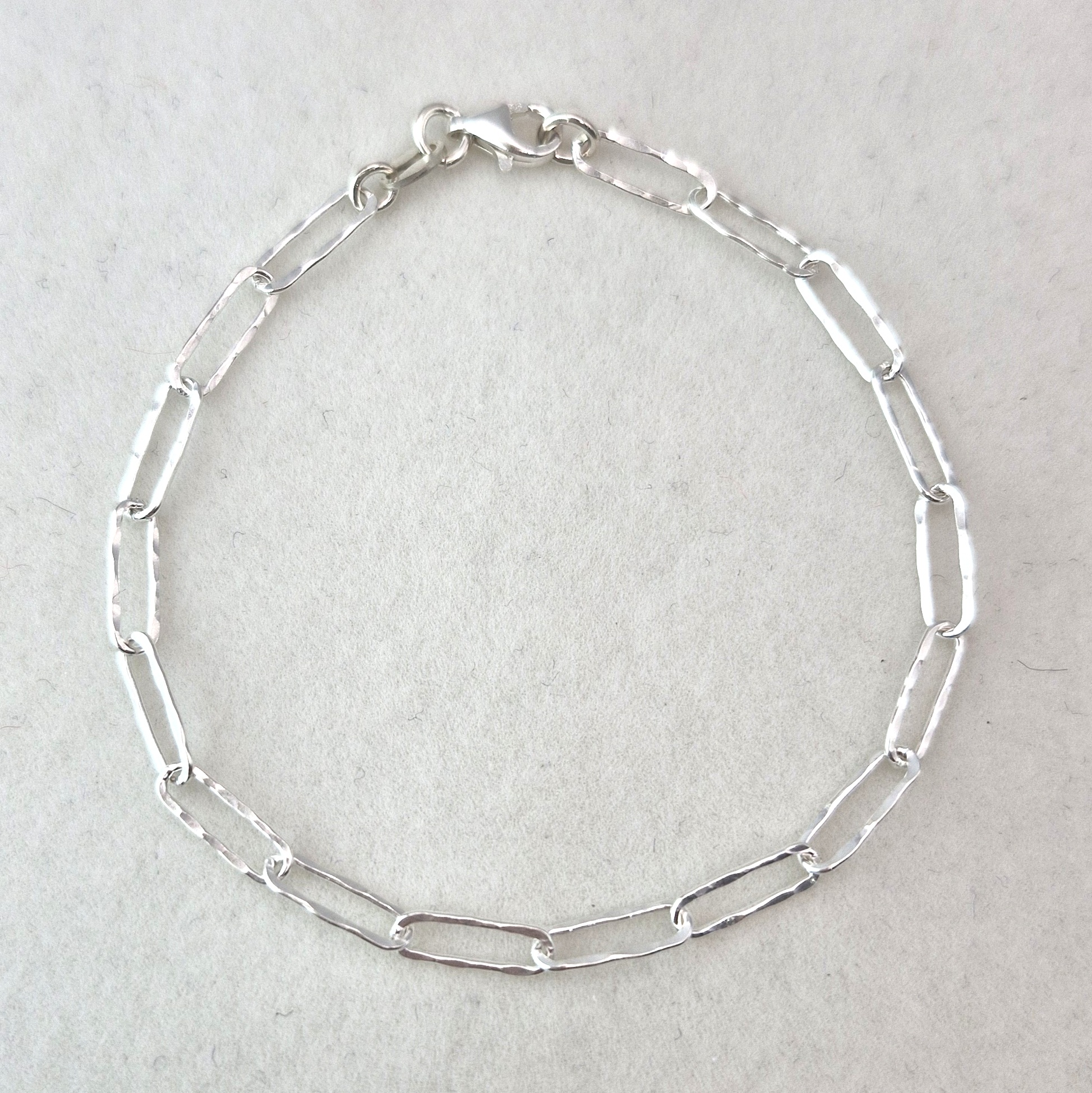 Oferujemy Państwu modną w tym sezonie bransoletkę o splocie typu spinacz/łańcuch z nierówną, gniecioną powierzchnią. Bransoletka w całości wykonany ze srebra próby 925.