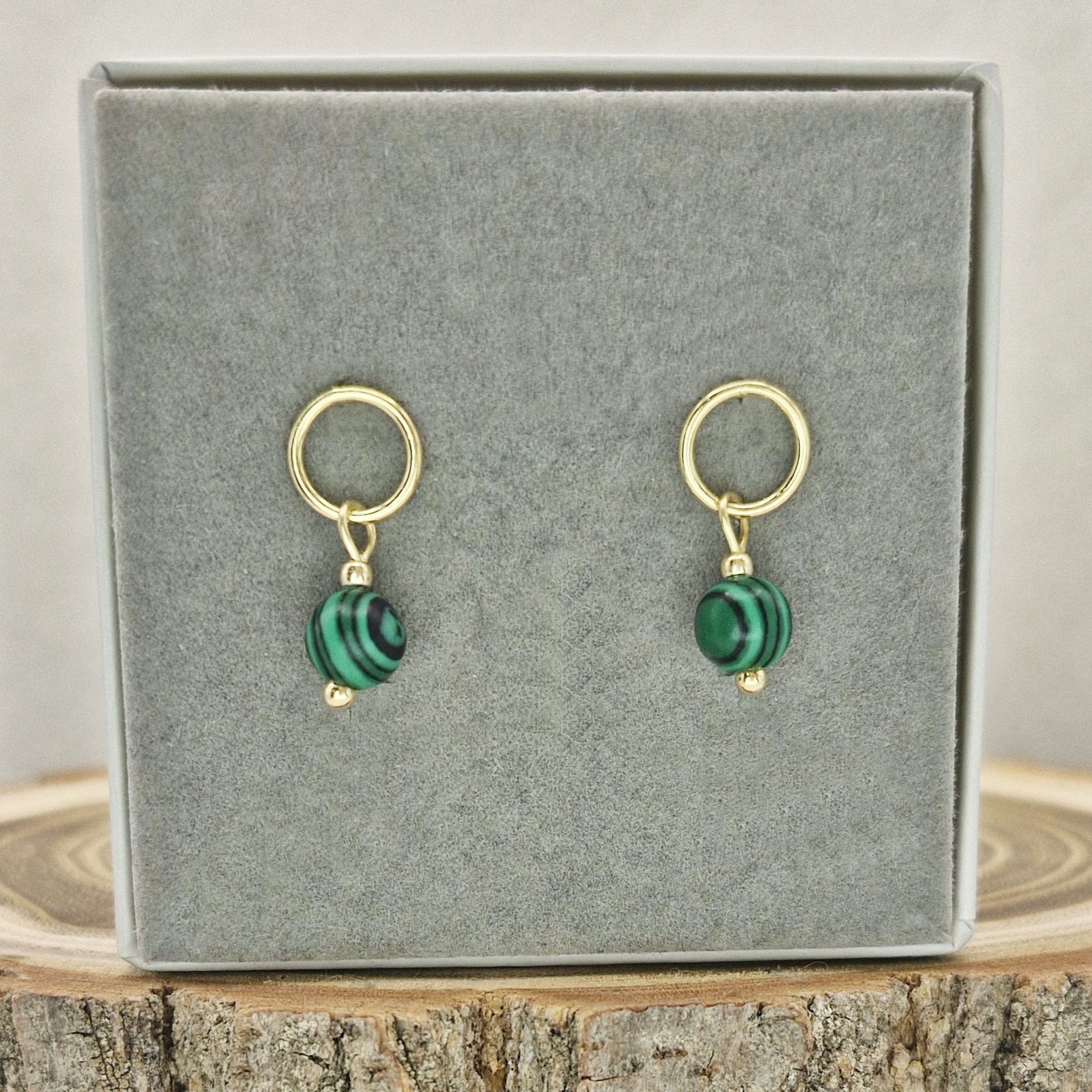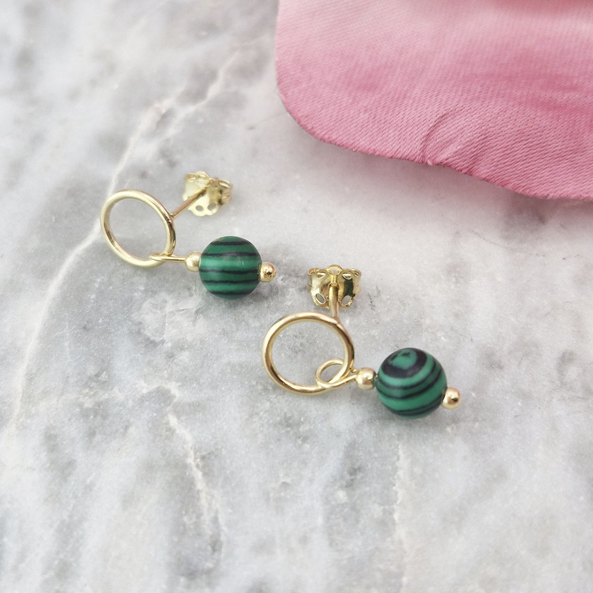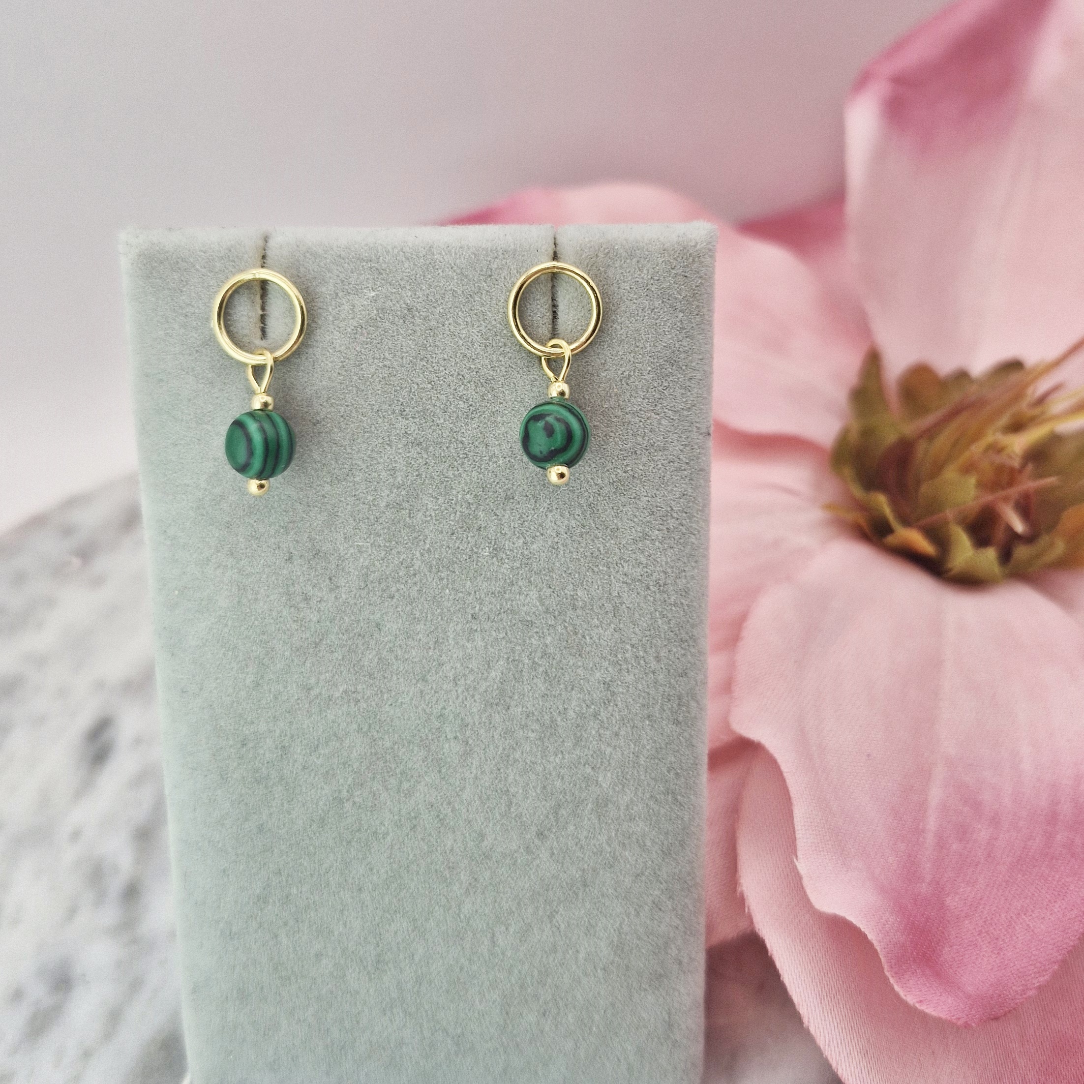 Oferujemy Państwu kolczyki na wygodnych sztyftach, wykonane z kamieni naturalnych - fasetowanego malachitu oraz ze srebra próby 925 pokrytego 24 karatowym złotem.