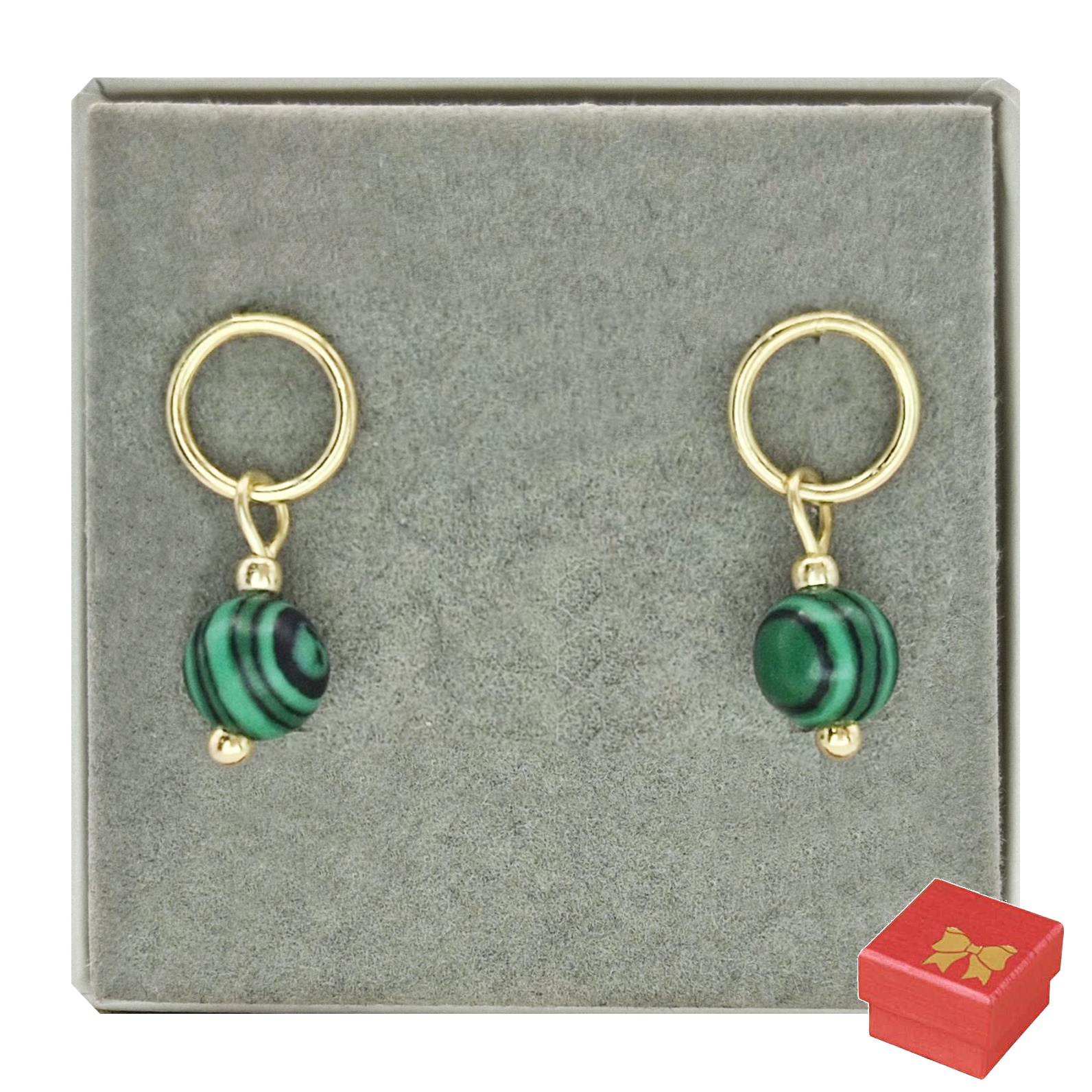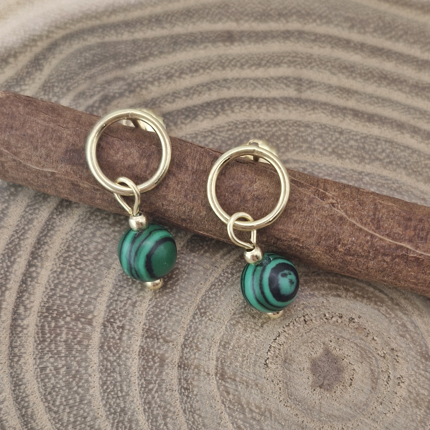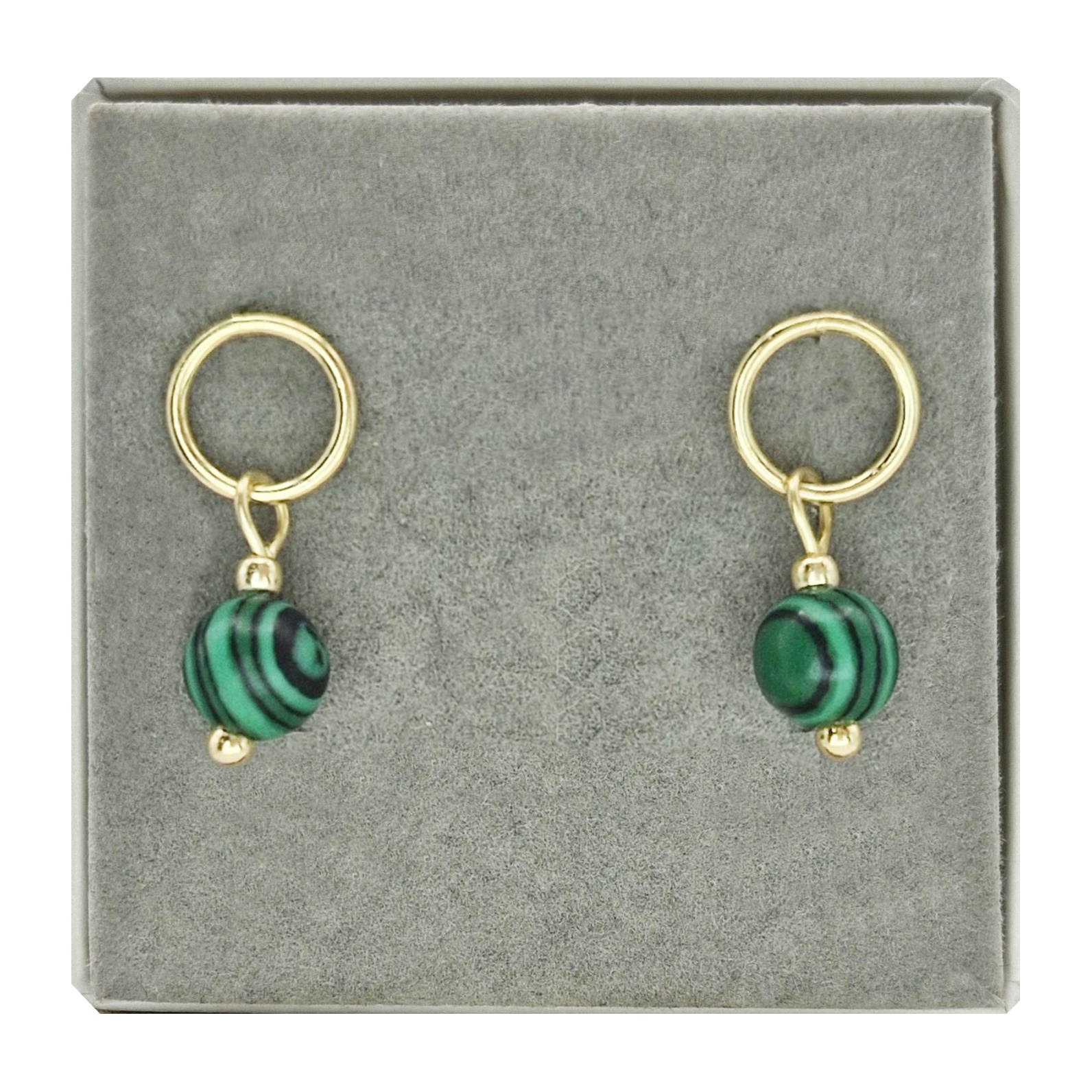Oferujemy Państwu kolczyki na wygodnych sztyftach, wykonane z kamieni naturalnych - fasetowanego malachitu oraz ze srebra próby 925 pokrytego 24 karatowym złotem.