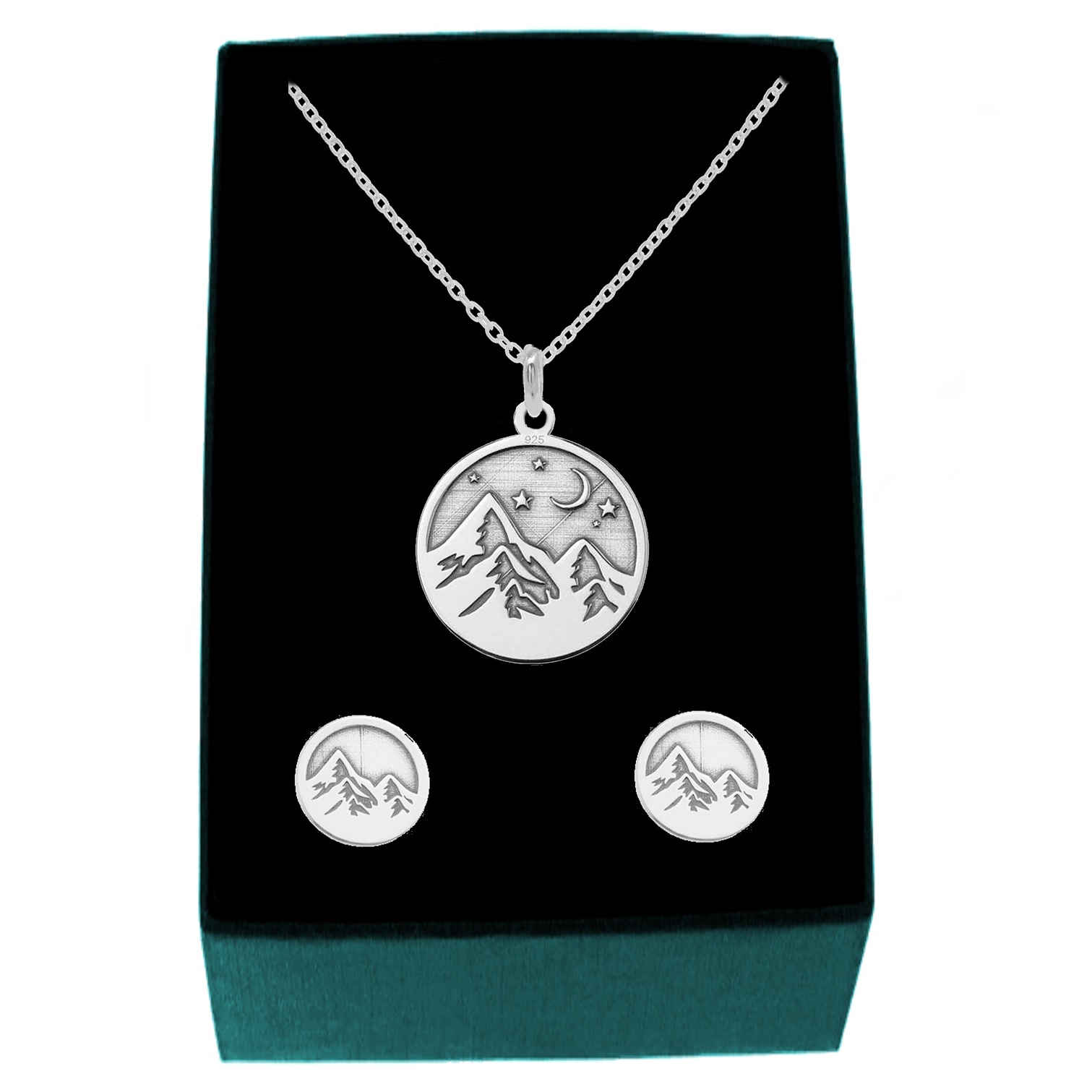Oferujemy Państwu komplet biżuterii z zawieszkami w kształcie kółeczek z motywem gór, w całości wykonany ze srebra próby 925.