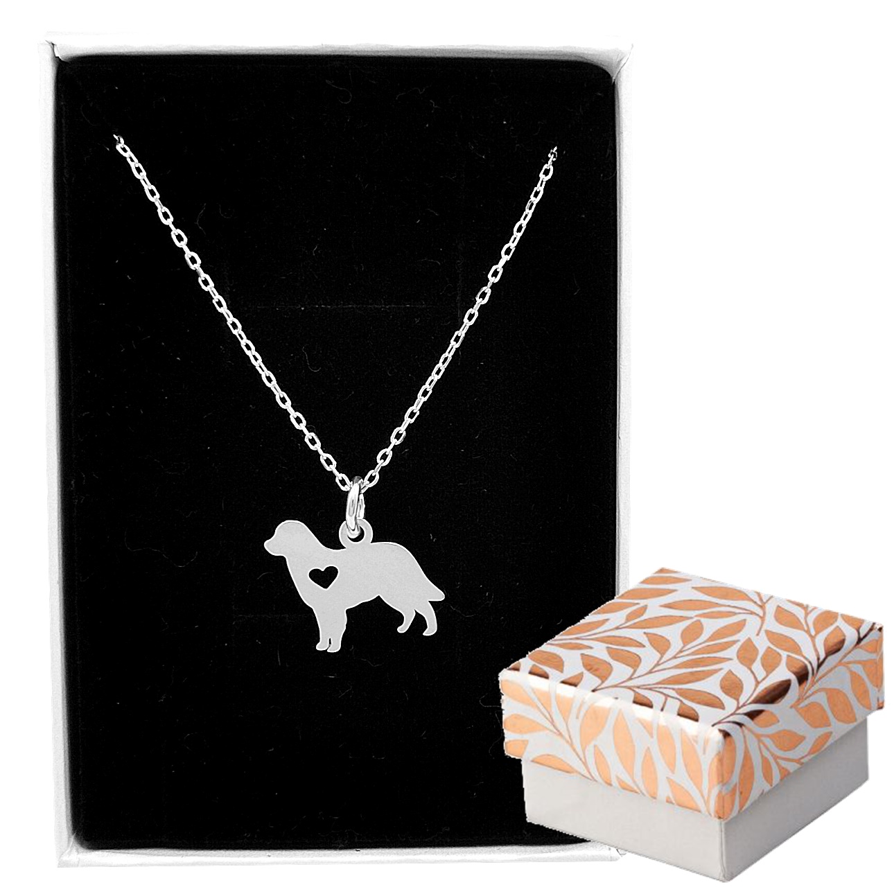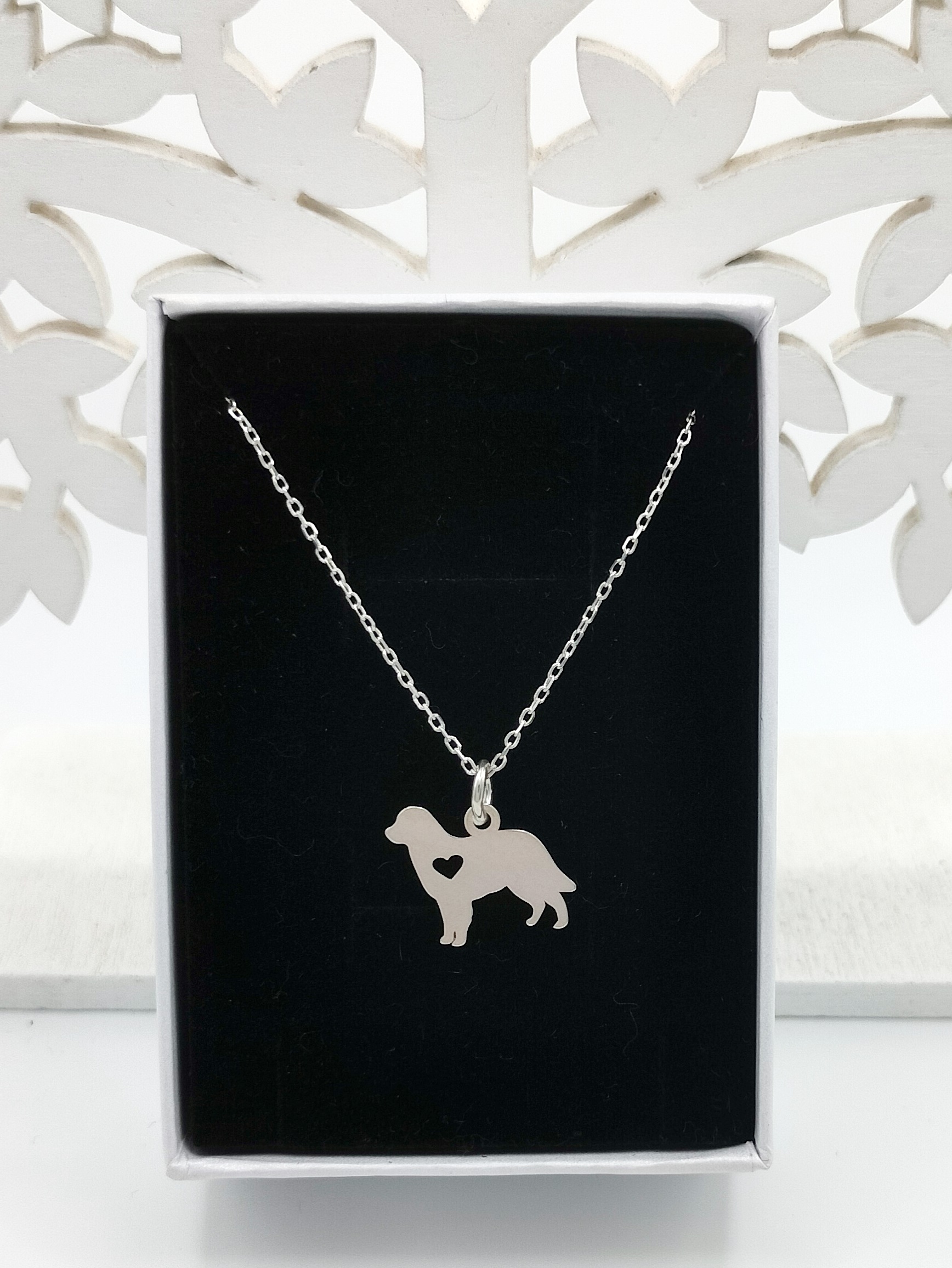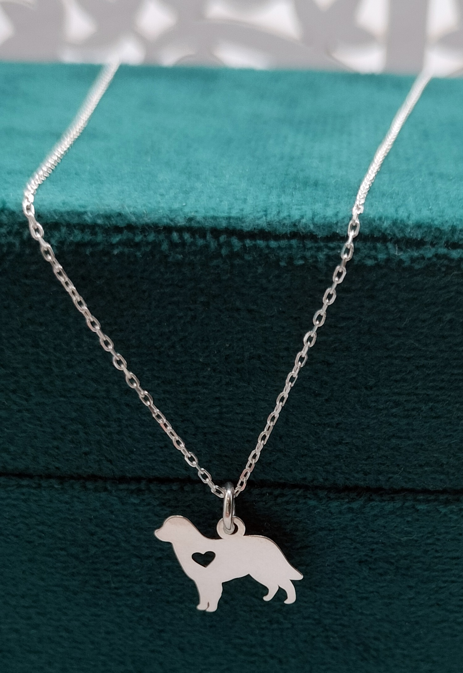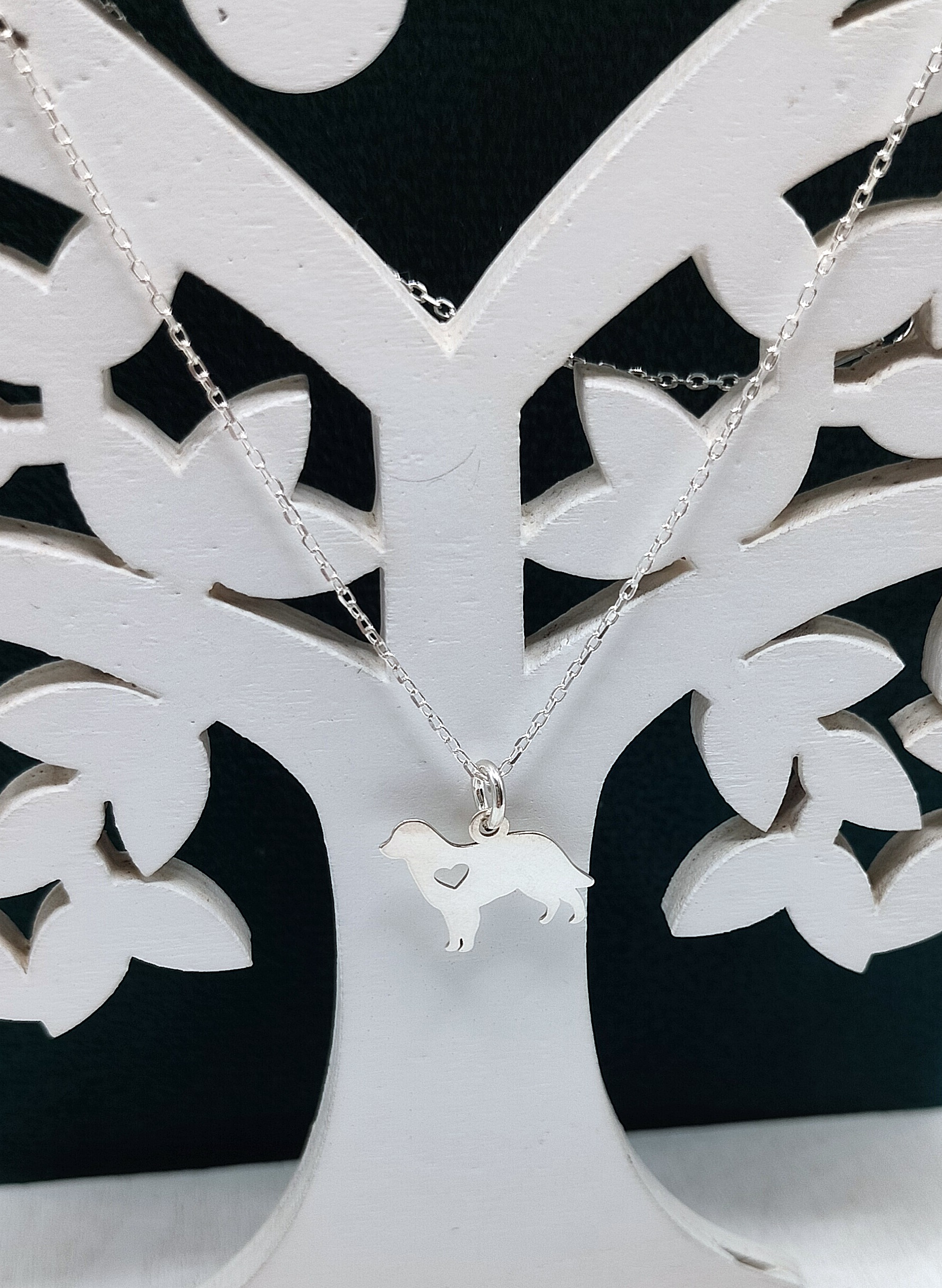 Oferujemy Państwu naszyjnik z zawieszką pieska z wyciętym serduszkiem. Naszyjnik w całości wykonany ze srebra próby 925.