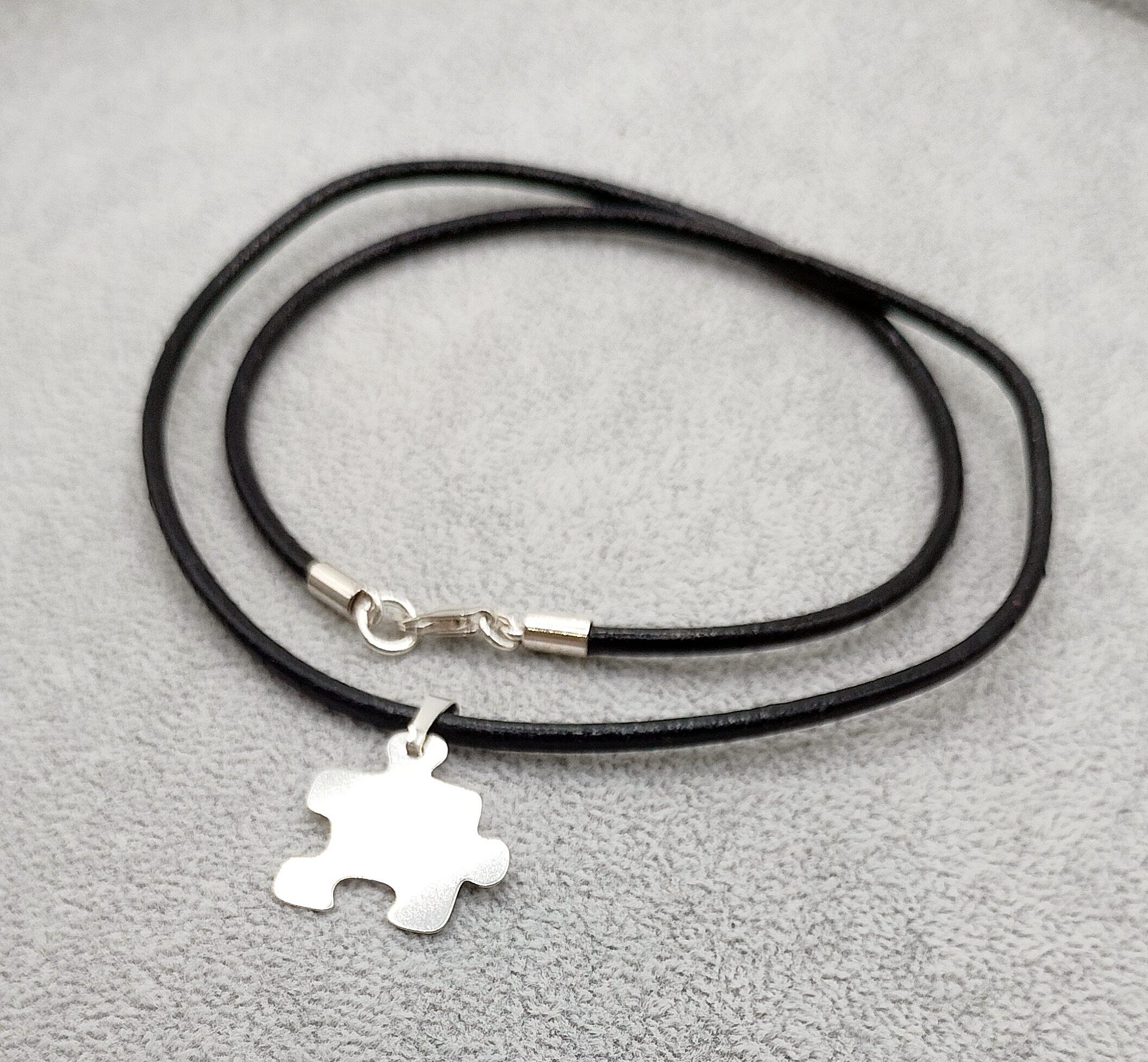 Oferujemy Państwu naszyjnik z zawieszką w kształcie puzzla. Naszyjnik wykonany ze srebra próby 925 oraz skóry naturalnej.