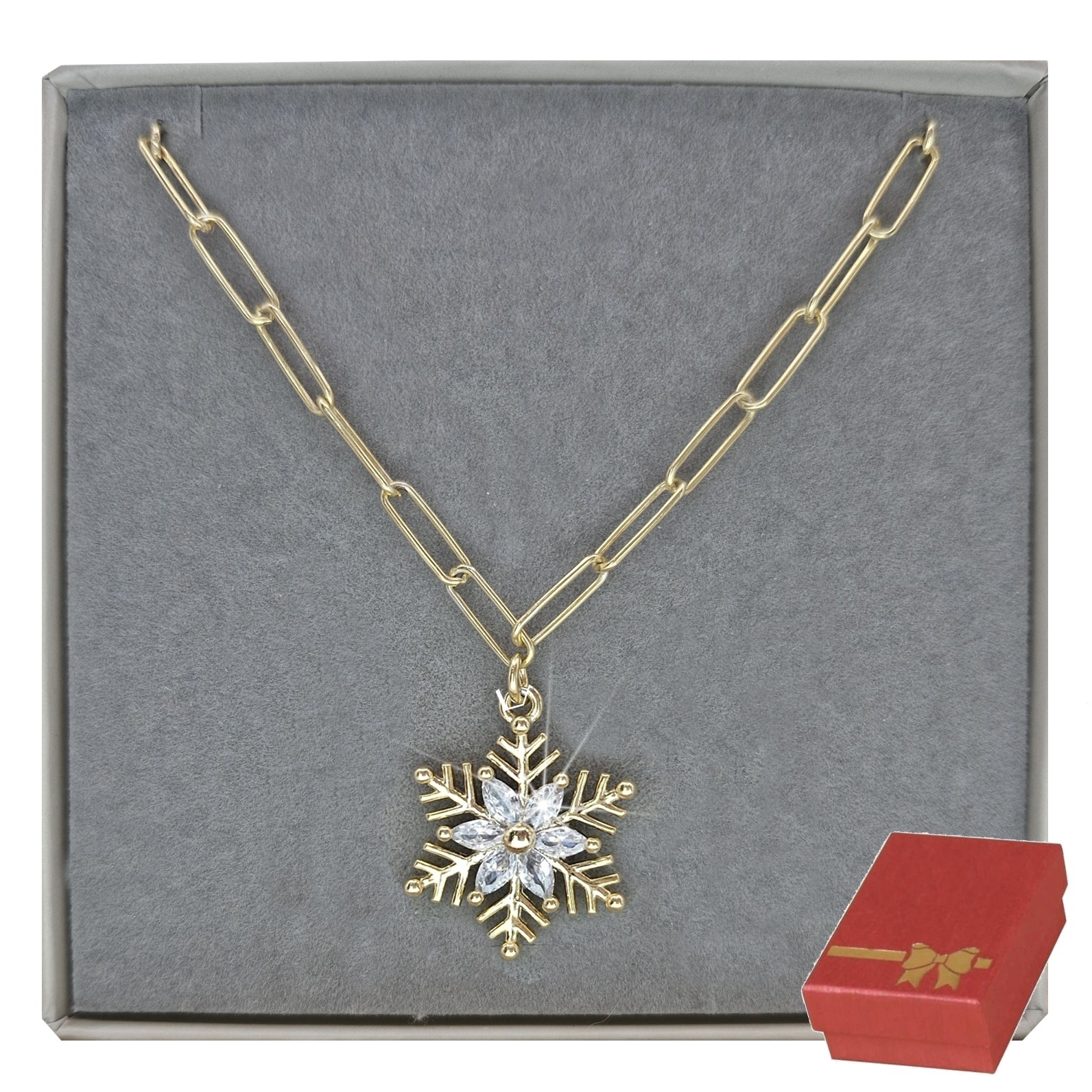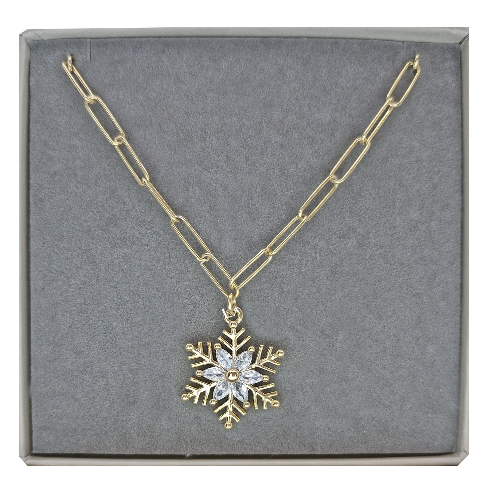 Oferujemy Państwu modny w tym sezonie naszyjnik o splocie typu spinacz/łańcuch z piękną zawieszką śnieżynką wysadzaną cyrkoniami. Naszyjnik w całości wykonany ze srebra próby 925 pokrytego 24 karatowym złotem.